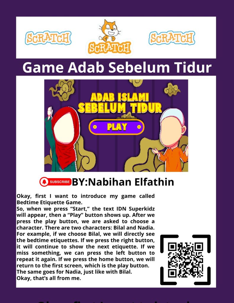 Assalamualaikum wr wb. Let me introduce myself, my name is Khairy Nabihan Elfathin, but you can call me Bihan. Today, I would like to present my project about a game called “Bedtime Etiquette Game.” Okay, let me give you the tutorial. When we press the “Start” button, the text IDN Superkidz will appear, and then a “Play” button shows up. After we press the play button, we can choose a character. There are two characters, Bilal and Nadia. For example, if we choose Bilal, the etiquettes before sleeping will appear. By pressing the right button, we can continue to the next etiquette. If we miss something, we can press the left button to repeat it again. If we press the home button, it will return us to the first screen with the play button. The same goes for Nadia, just like with Bilal. Okay, that’s all from me. Wassalamualaikum wr wb.
