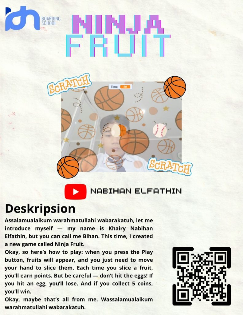 Assalamualaikum warahmatullahi wabarakatuh, let me introduce myself — my name is Khairy Nabihan Elfathin, but you can call me Bihan. This time, I created a new game called Ninja Fruit. Okay, before we start playing, I’d like to show you my poster. This is my poster — here’s the title, my YouTube channel, and the QR code for my game. If you want to play my game, you just need to scan this QR code. Alright, let’s get straight to the game! So, here’s how to play: when you press the Play button, fruits will appear, and you just need to move your hand to slice them. Each time you slice a fruit, you’ll earn points. But be careful — don’t hit the eggs! If you hit an egg, you’ll lose. And if you collect 5 coins, you’ll win. Okay, maybe that’s all from me. Wassalamualaikum warahmatullahi wabarakatuh.