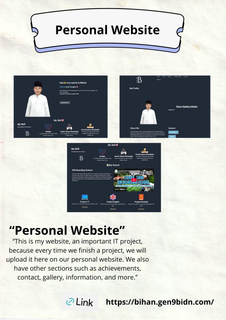 “This is my website, an important IT project, because every time we finish a project, we will upload it here on our personal website. We also have other sections such as achievements, contact, gallery, information, and more. I created this website in about one week because making a website is quite complicated. The most difficult part was creating the homepage, since it has many elements and is quite complex.”